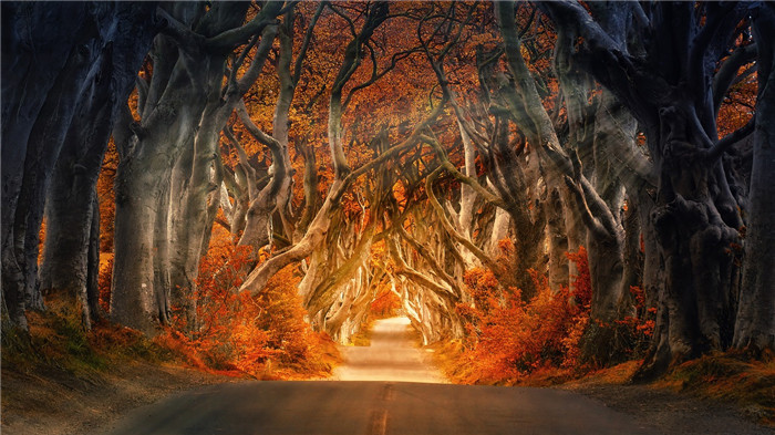 北愛爾蘭地區(qū)阿莫伊村附近有一條被譽為世界上最美樹木隧道的地方。路邊的毛櫸樹層層疊疊地排列著,形成一道樹蔭濃密、寧靜怡人的鄉(xiāng)村風光。300多年的歷史為這條道路抹上了濃郁的歷史氣息。這就是權(quán)游中連接北境長城、君臨、風息堡的重要交通樞紐——國王大道。