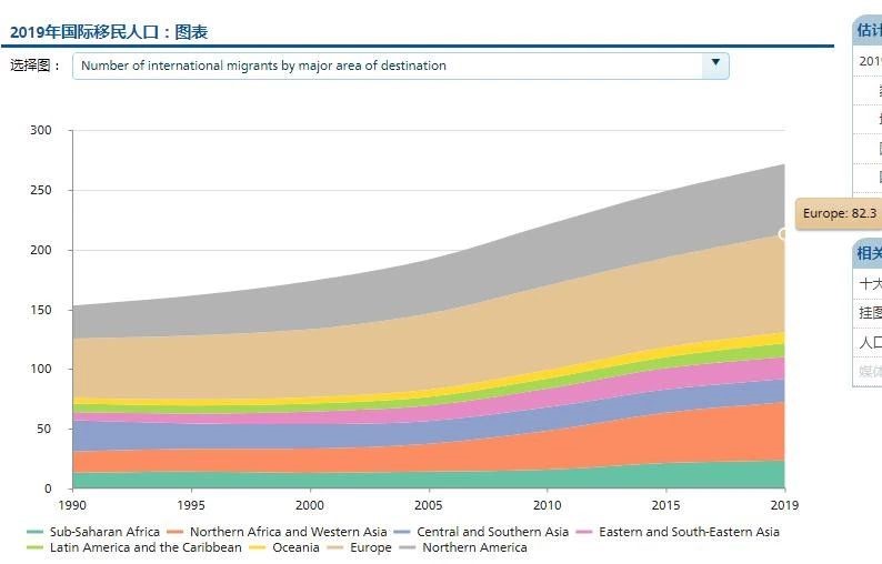從移民接收地區(qū)來看,歐洲接收的移民人數(shù)最多,達到8200萬人,北美接收5900萬移民排名第2。