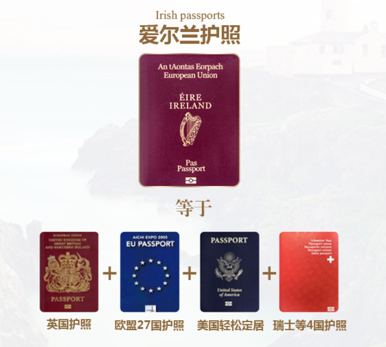 移民愛(ài)爾蘭,不僅可享受愛(ài)爾蘭純正英式教育、廣闊職業(yè)發(fā)展、優(yōu)渥商業(yè)機(jī)會(huì)和優(yōu)厚福利保障,取得愛(ài)爾蘭護(hù)照后,還能輕松跳板歐盟+英國(guó)+美國(guó)+瑞士,坐擁全球頂級(jí)資源。
