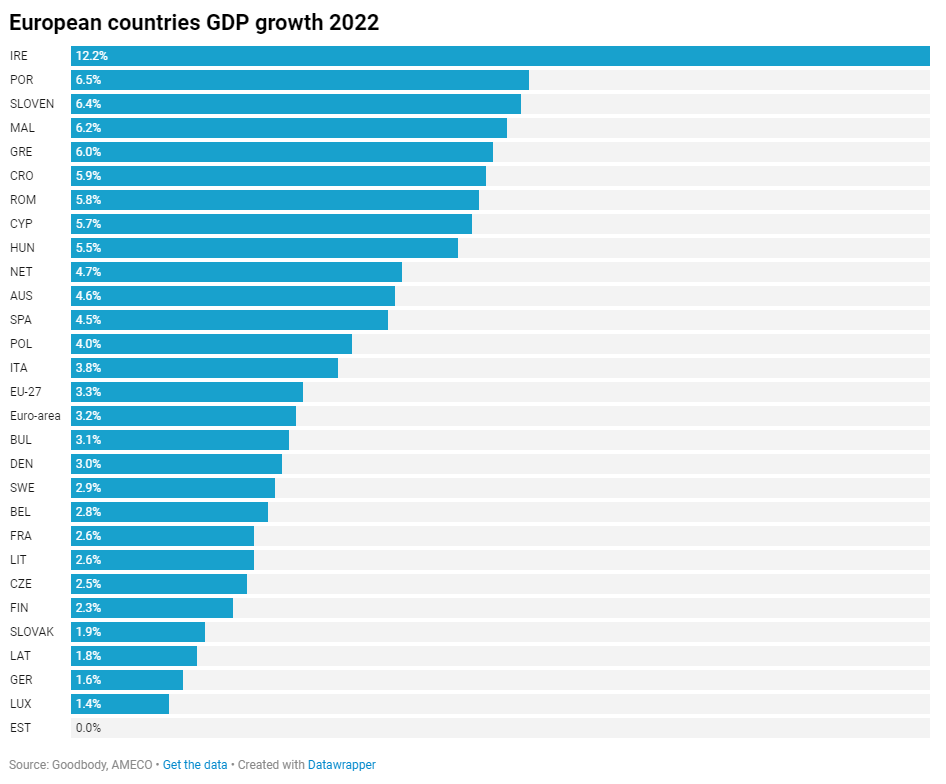 盡管全球經濟大幅放緩,但愛爾蘭經濟卻仍高速增長12.2%,大大超過政府預期,再次成為歐盟增長最快的經濟體,幾乎是排名第二的葡萄牙(6.5%)的兩倍,是歐盟平均水平(3.3%)的近四倍。