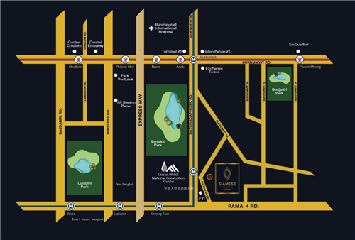 Siamese Exclusive Queens 位于拉瑪四路,距地鐵皇后詩麗吉會展中心只有50米,據《曼谷郵報》和《國家》雜志的報道中我們可以預測此地段的未來發展趨勢,項目位于地鐵沿線,周邊配套設施齊全,更值得一提的是項目同時毗鄰曼谷最大的公園benjakiti 水城公園和lumpini綠肺公園、使得我們的住宅鬧中取靜,大大提升了居住環境的舒適感,在曼谷此類項目極為稀缺。