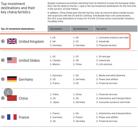 根據(jù)世界權(quán)威會(huì)計(jì)師事務(wù)所安永(EY)最新出爐的一系列數(shù)據(jù)和排名顯示,英國(guó)并沒有受到脫歐疑云籠罩,全球投資者依然對(duì)英國(guó)充滿信心。