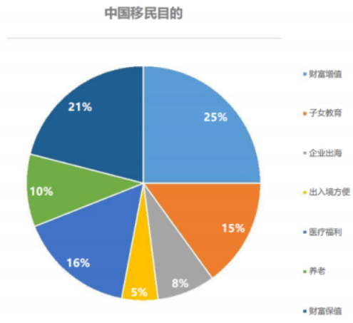 從移民需求來看,財產(chǎn)增值成為了目前最主要的移民原因,占比高達25%。其次是醫(yī)療福利占比21%;財富保值占比16%;子女教育占比15%;養(yǎng)老需求占比10%。