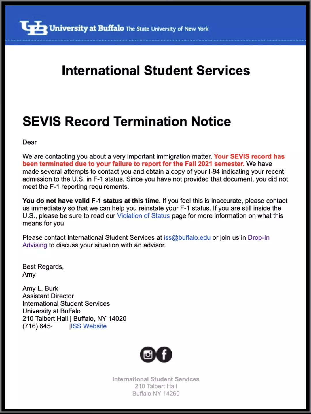 今年9月28日,紐約州立大學(xué)布法羅(SUNY Buffalo)分校的多名留學(xué)生,其中包括至少30名中國(guó)留學(xué)生,收到校方郵件通知:由于學(xué)生未能在開(kāi)學(xué)一個(gè)月的時(shí)間內(nèi),向?qū)W校的國(guó)際學(xué)生事務(wù)辦公室報(bào)到,并遞交I-94副本,校方不再認(rèn)可其留學(xué)生身份,根據(jù)美國(guó)相關(guān)的移民法律,這些學(xué)生的F-1簽證將被終止,并須盡快離境!