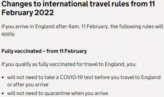 最新消息,英國交通大臣格蘭特·沙普斯(Grants Shapps)表示,從當(dāng)?shù)貢r(shí)間2月11日凌晨4時(shí)起,已完全接種疫苗的旅客入境時(shí)只需填寫旅客定位表,在入境英國前后都無需進(jìn)行任何新冠測(cè)試。12-15歲兒童也將在春季期中假期前開始獲得電子版的疫苗接種證明,便于出境度假。