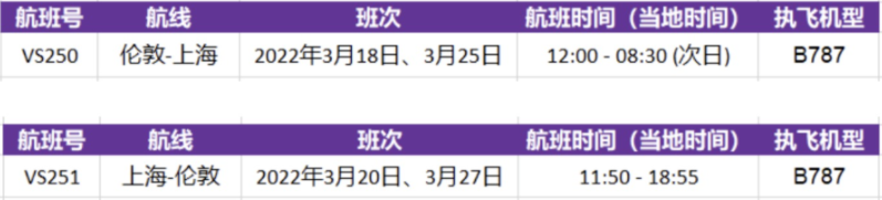 3月「上海-倫敦」試運(yùn)營(yíng)VS251分別在3月20日及27日—當(dāng)日11:50起飛、當(dāng)日18:55抵達(dá)。